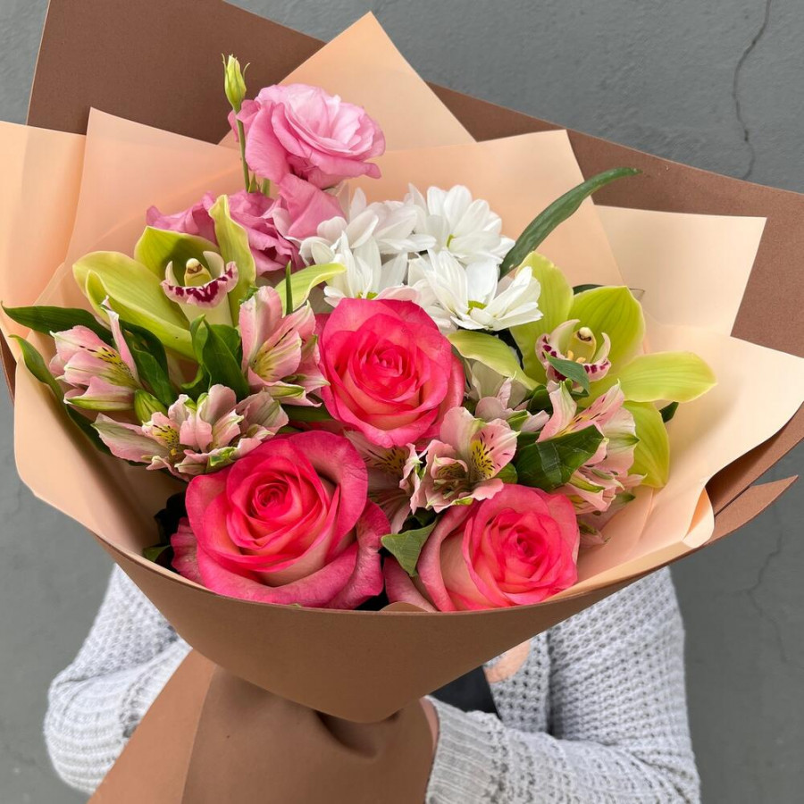 На фото букет «гармония орхидей». В составе: альстромерия 2 шт, орхидея 2 шт, роза 3 шт, хризантема кустовая 1 шт, эустома (лизиантус) 1 шт, дизайнерская упаковка 1 шт, атласная лента 1 шт, . Все цветы свежие и ароматные, букет красиво оформлен и отлично подходит для подарка. Доступна доставка цветов или самовывоз.
